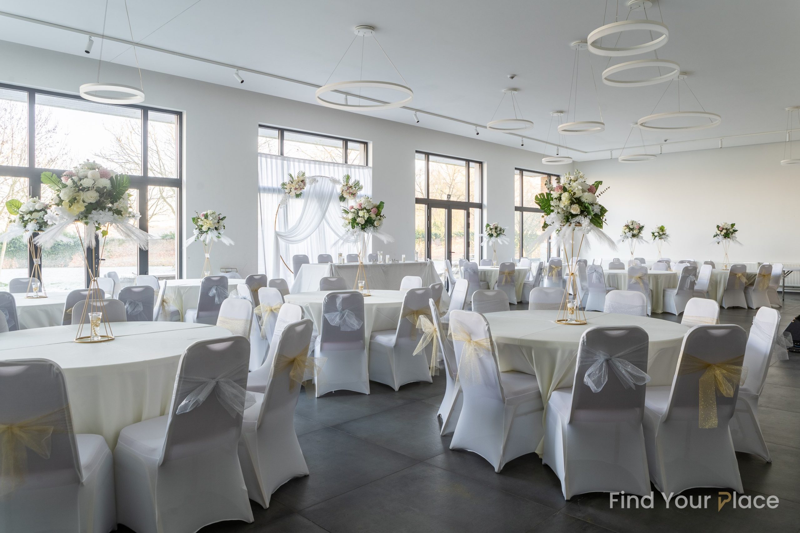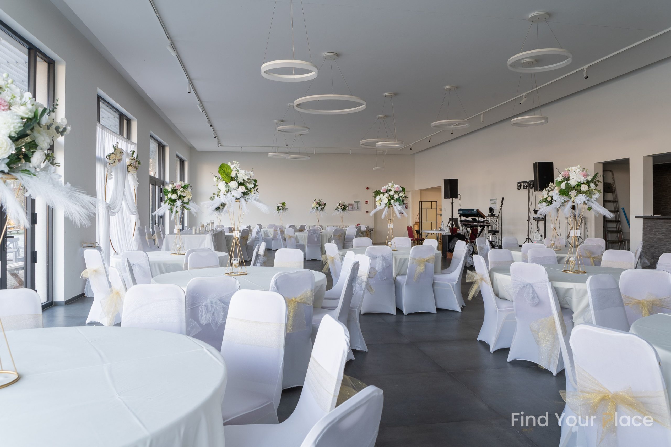 Budget tout inclus: Tables rondes ou rectangulaites selon votre choix + nappes couleur crème , chaises + housses de chaises, 18 mange-debout